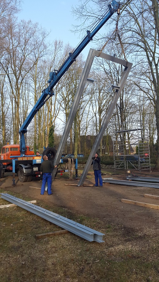 Bei dieser Holzkonstruktion sind aufwendige und kräftige Verstrebungen erforderlich, um die besonderen dynamischen Schwingungen aufzunehmen. Uns schwebte eine ganz andere sehr leichte Stahlkonstruktion vor, die auch in der Lage ist, die dynamischen Lasten der Glocke aufzunehmen. Wir entschieden uns für eine feuerverzinkte Stahlbügelkonstruktion in Kreuzform mit einer Stahlscheibe als Witterungsschutz.