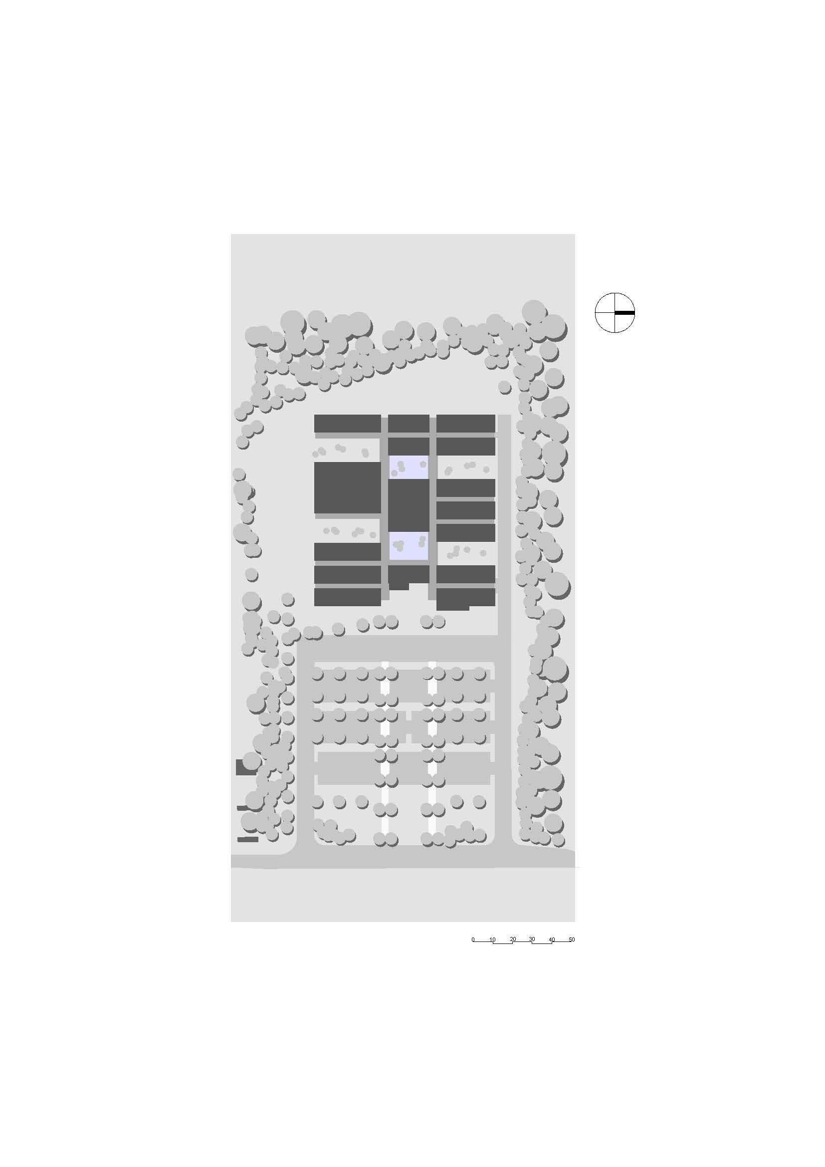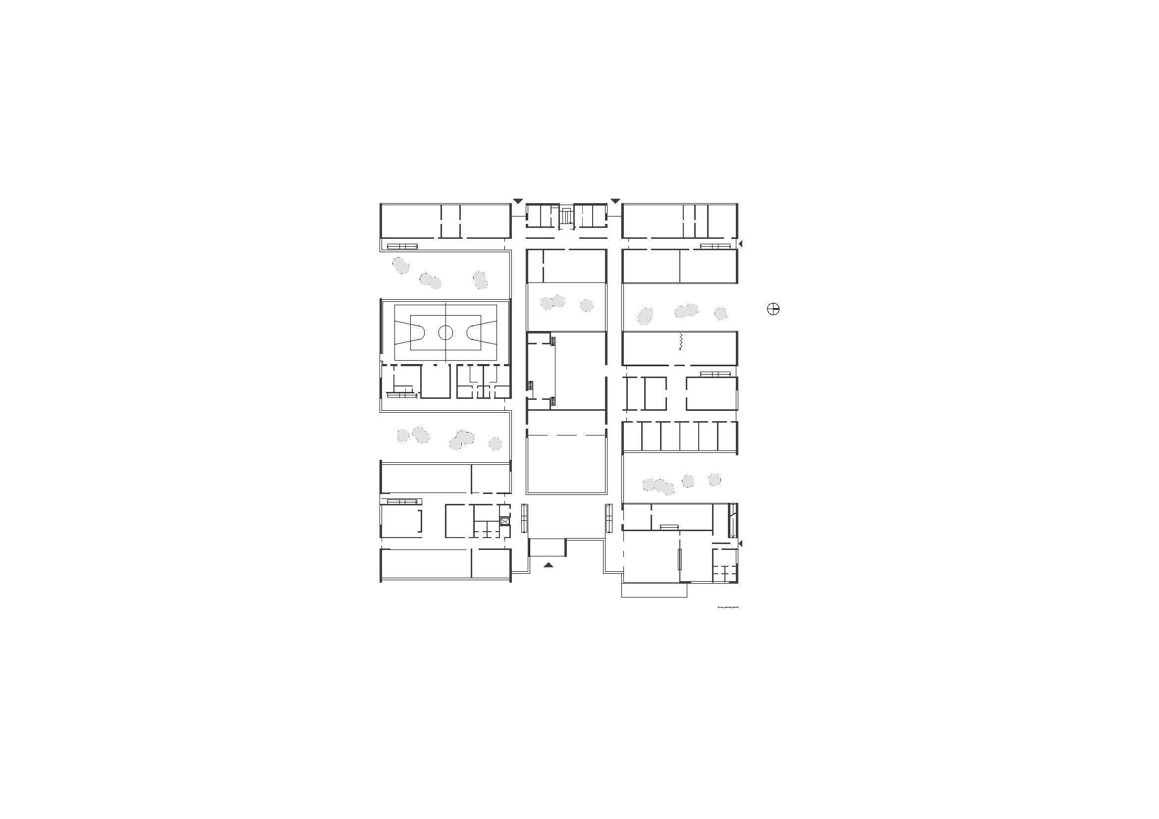 Die Gliederung der verschiedenen Bereiche in einzelne Pavillons, die über Stichflure von den Haupterschließungsachsen betreten werden, macht den gesamten Schulkomplex sehr übersichtlich und erleichtert besonders den Schülern die Orientierung. Durch die unterschiedlich breiten Pavillons und die sich daraus ergebenden versetzten Anschlüsse an die Erschließungswege ergibt sich eine interessante Anlage, die nie langweilig wird und abwechslungsreiche Innenraumfolgen bietet. Die gesamte Schulanlage ist zweigeschossig und alle Pavillons sind konsequent mit Pultdächern versehen.