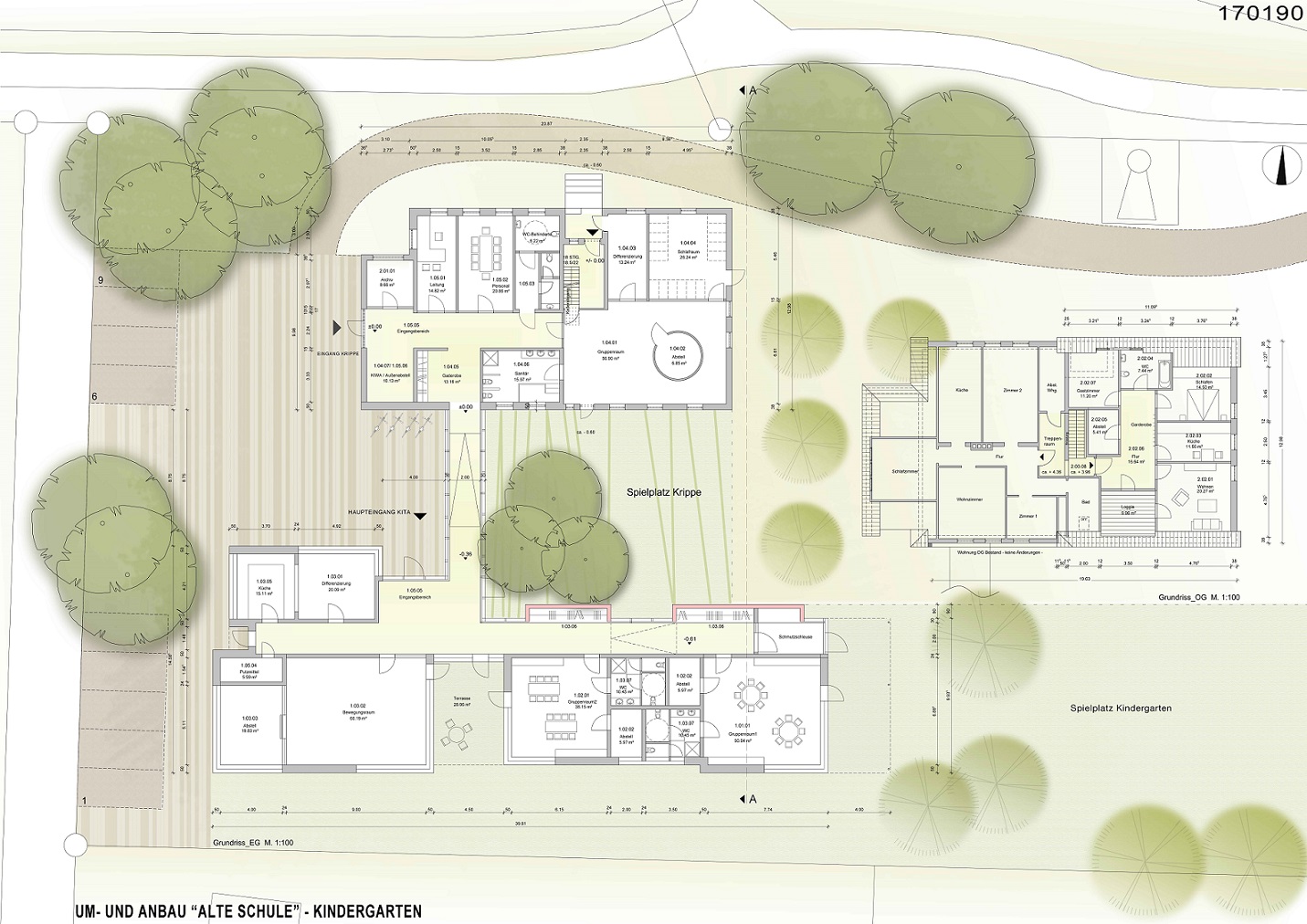 Im Erdgeschoss Altbau haben wir den Bereich der Verwaltung und der Krippe mit den erforderlichen Nebenräumen angeordnet. Im Erweiterungsbau sind alle zukünftigen Räume des Kindergartens beherbergt. Aufgrund der orthogonalen Struktur des Erweiterungsbaus ergibt sich für die Krippe ein 3-seitig umschlossener Außenspielbereich. Der Spielbereich des Kindergartens wird in der bereits jetzt bestehenden Längsstruktur fortgeführt.