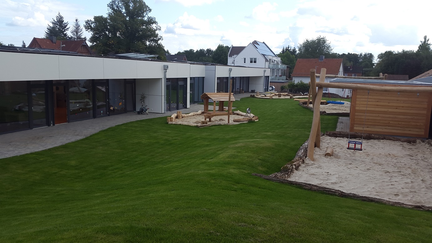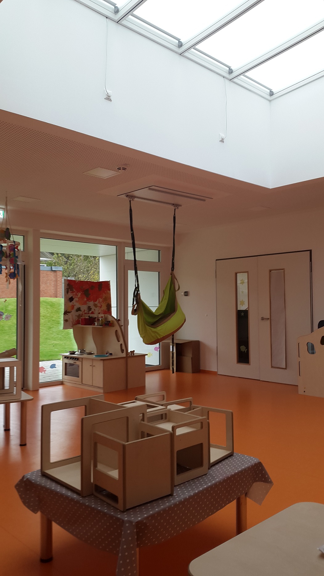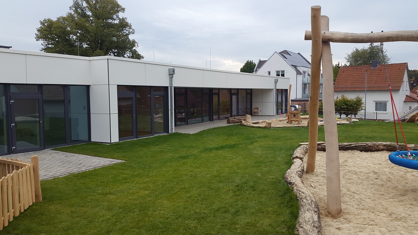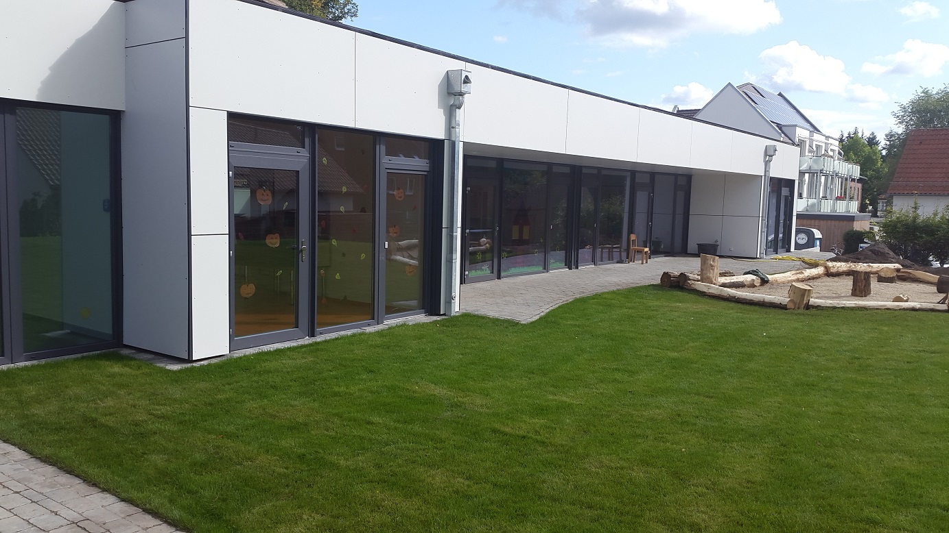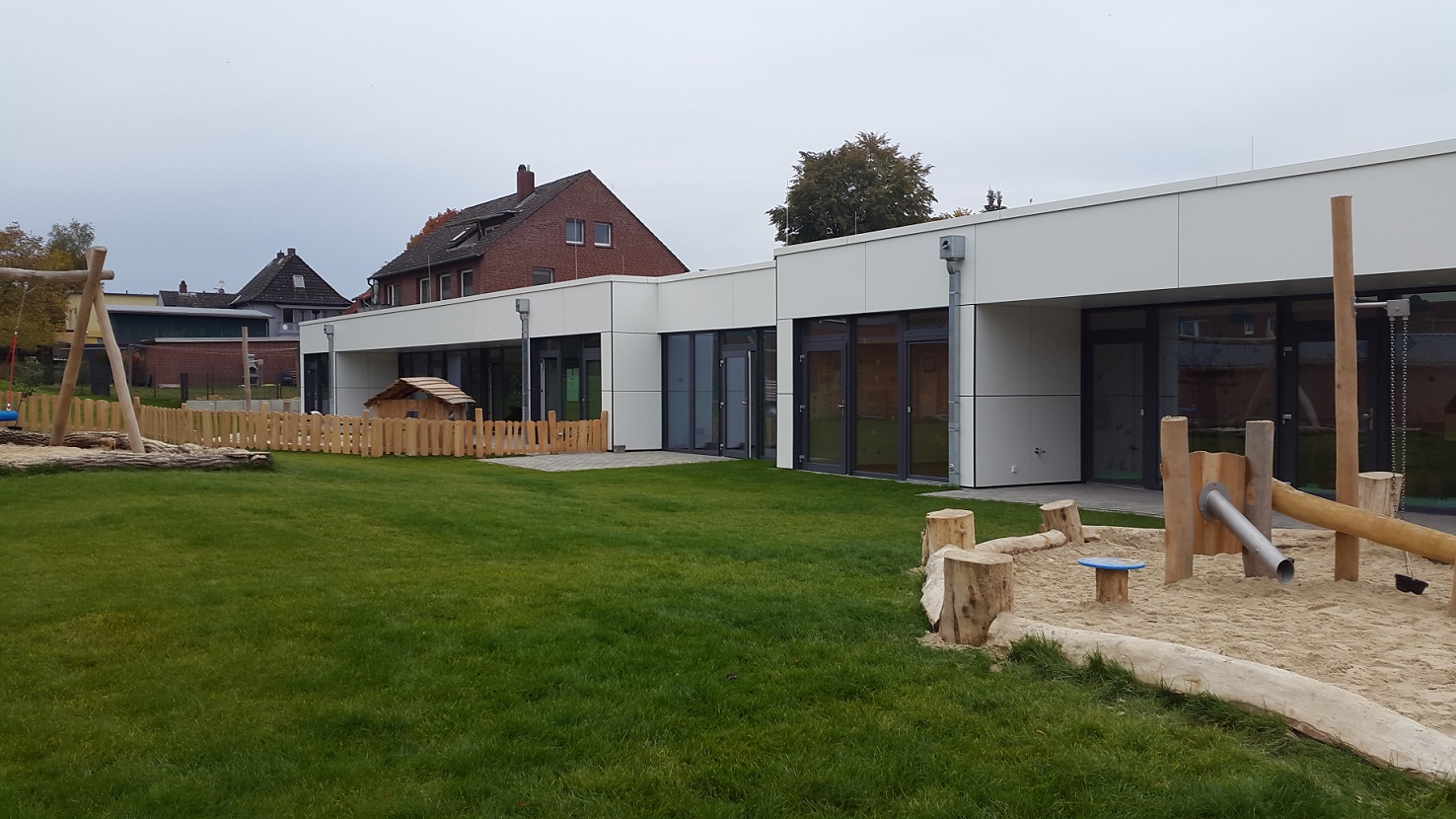 Die Planung für den Neubau der 4-Gruppen-Kita für 80 Kinder war eine besondere Herausforderung. Die Größe des Grundstücks war knapp bemessen, sodass wir sehr sparsam mit den Flur- und Verkehrsflächen umgehen mussten. Ein hoher Kostendruck machte die Sache auch nicht einfacher. Als weitere Herausforderung war die Topografie, denn das Grundstück fällt von Nord nach Süd um sagenhafte 3 Meter. Das 52 Meter lange Gebäude wurde so platziert, dass es sich im Norden eingräbt und im Süden aus der Topografie rauswächst.