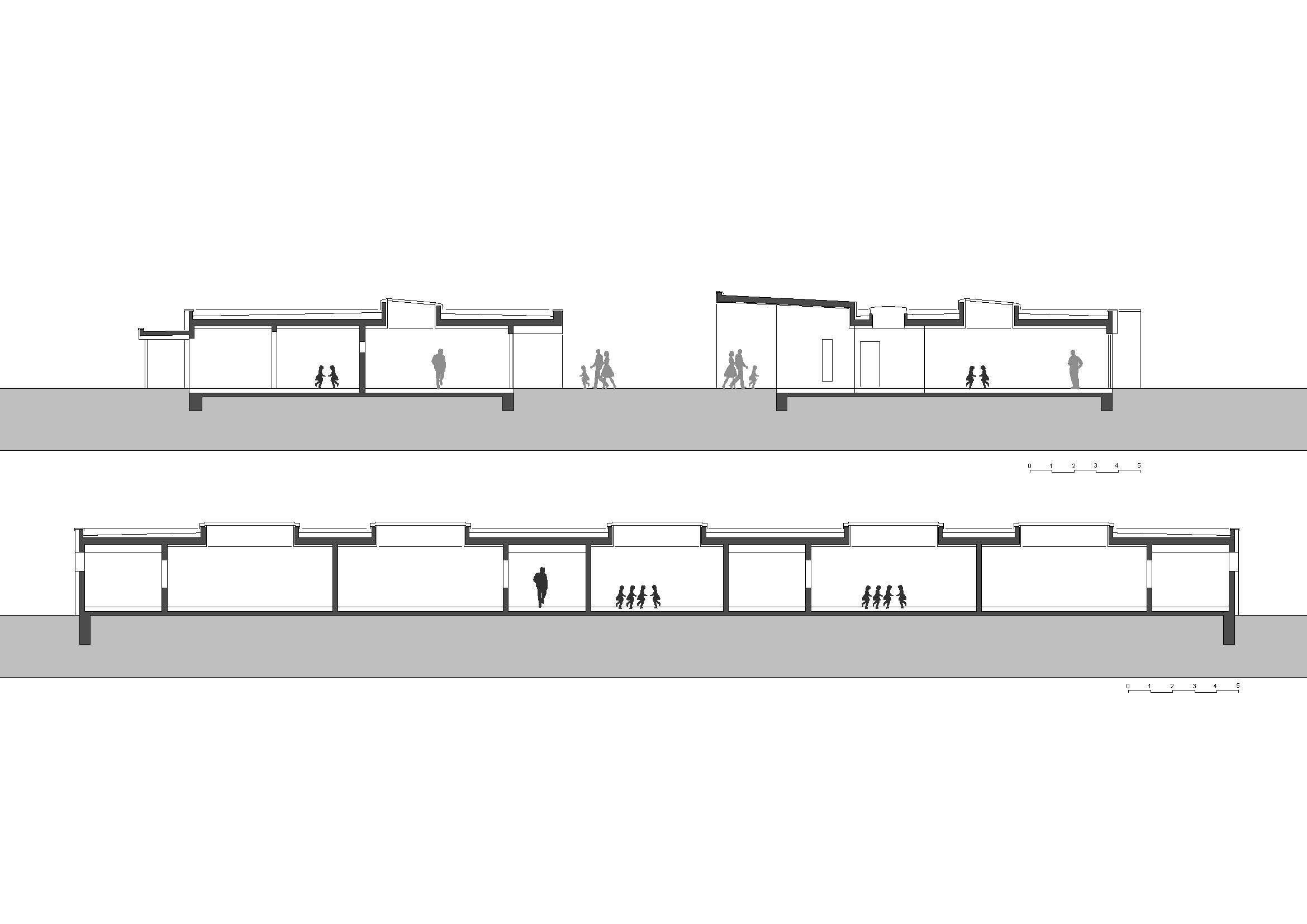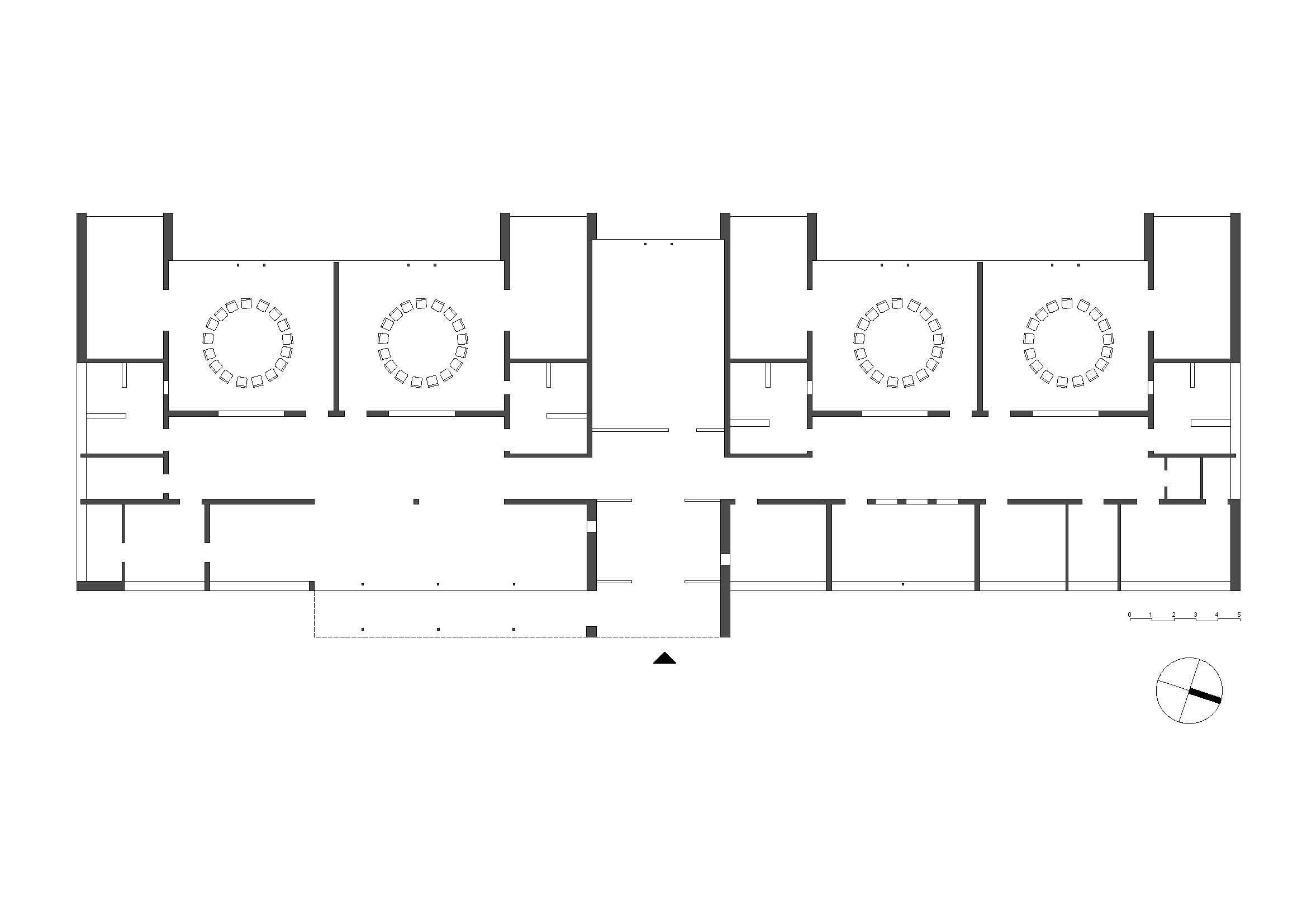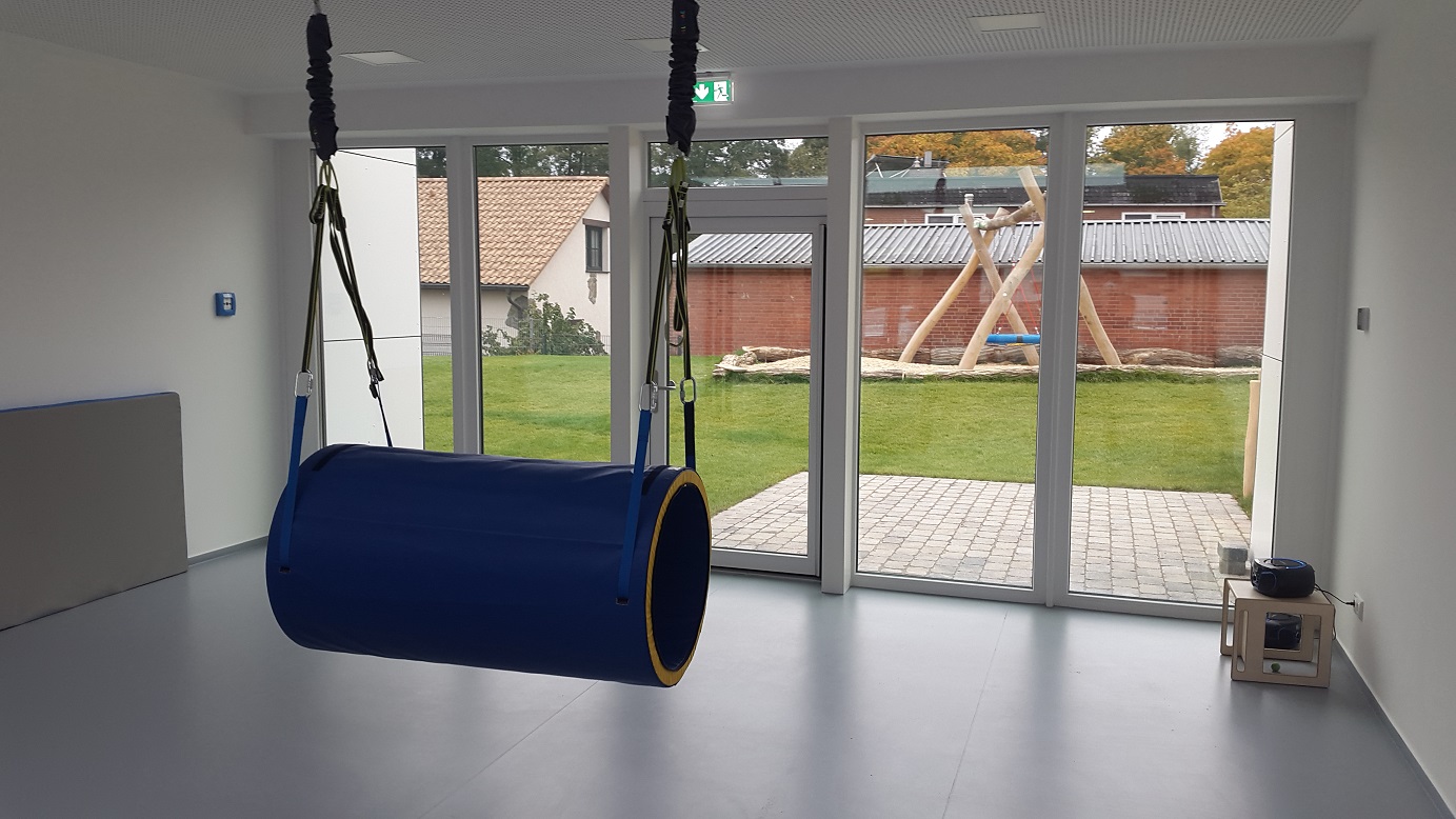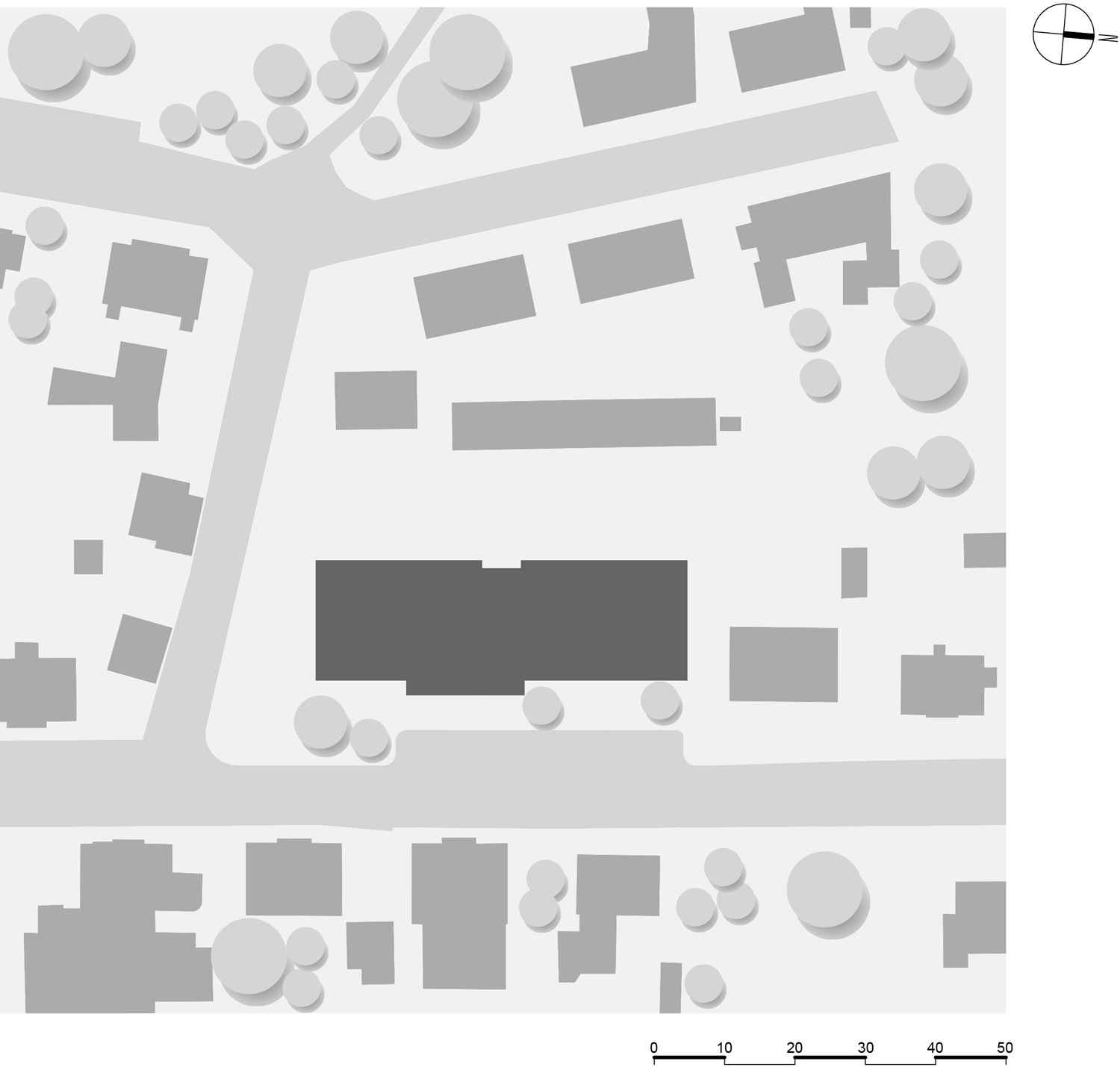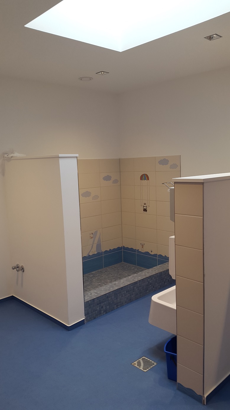 Die Planung für den Neubau der 4-Gruppen-Kita für 80 Kinder war eine besondere Herausforderung. Die Größe des Grundstücks war knapp bemessen, sodass wir sehr sparsam mit den Flur- und Verkehrsflächen umgehen mussten. Ein hoher Kostendruck machte die Sache auch nicht einfacher. Als weitere Herausforderung war die Topografie, denn das Grundstück fällt von Nord nach Süd um sagenhafte 3 Meter. Das 52 Meter lange Gebäude wurde so platziert, dass es sich im Norden eingräbt und im Süden aus der Topografie rauswächst.