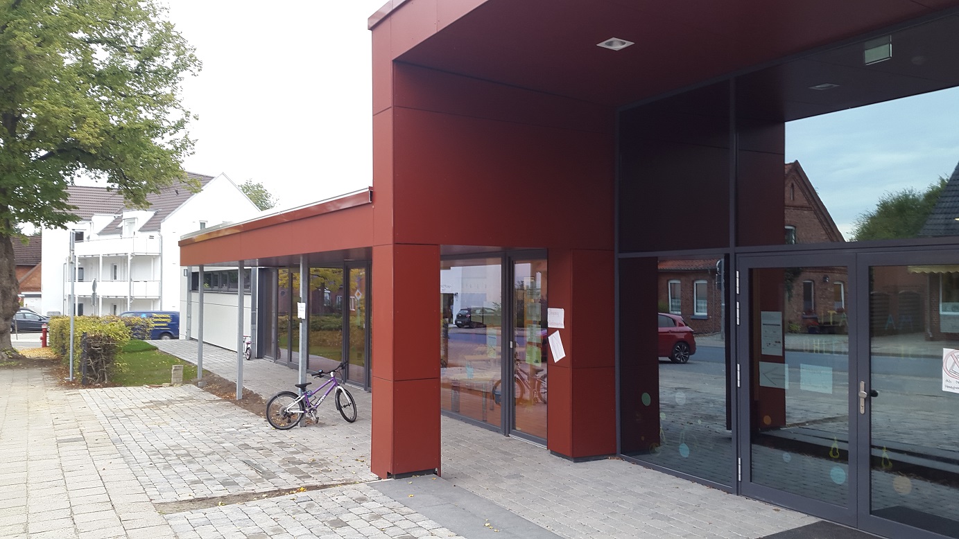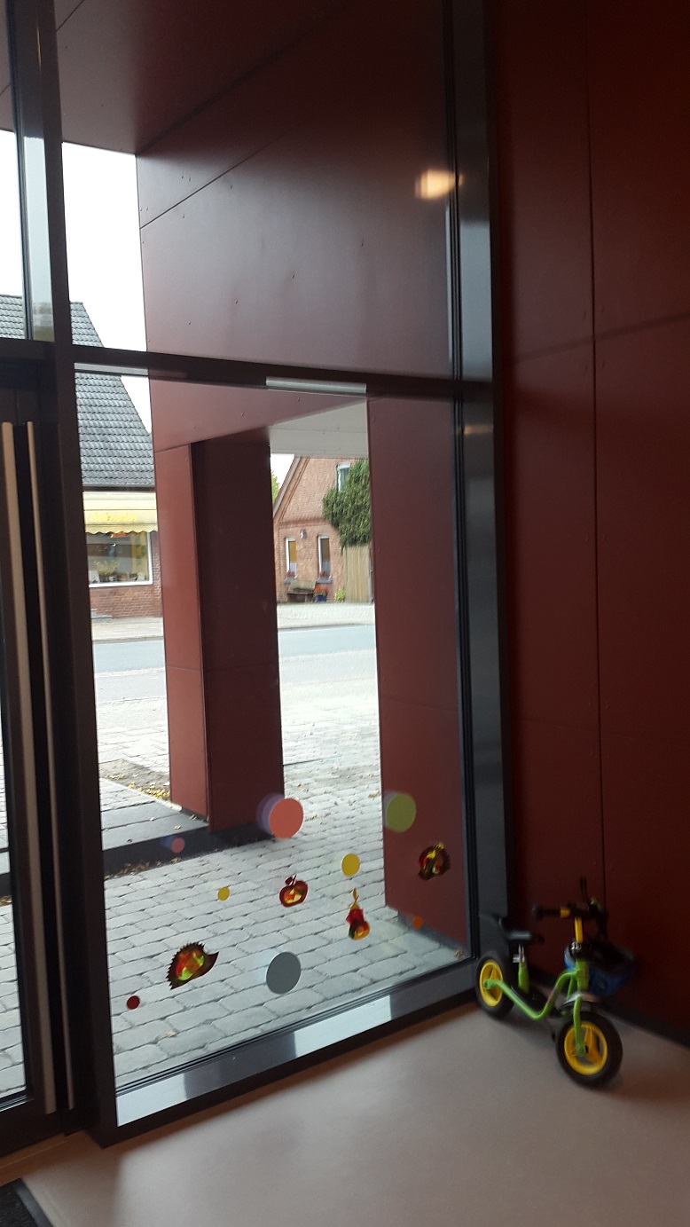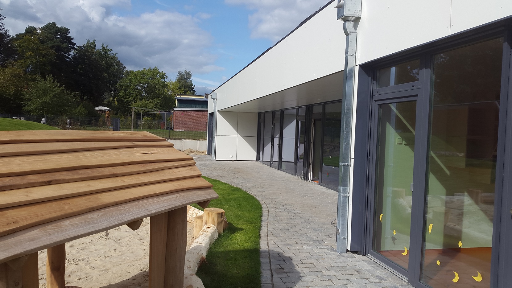Entstanden ist nun eine neue unverwechselbare Kita mit eleganter weißer Fassade und roten Akzenten, mit überdachten Freiflächen vor den hellen Gruppenräumen, mit Panoramaverglasungen in den Dächern und mit extensivem Gründach als 5. Fassade.