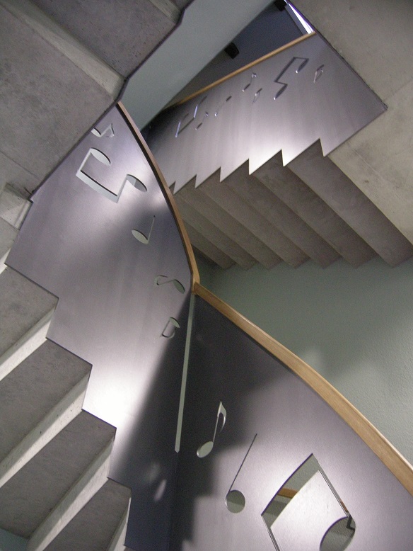Die Handläufe bestehen aus 8 mm Stahlblechen mit gelaserten Musiknoten und einem Eiche-Holzhandlauf, der in das Stahlblech eingenutet wurde.
