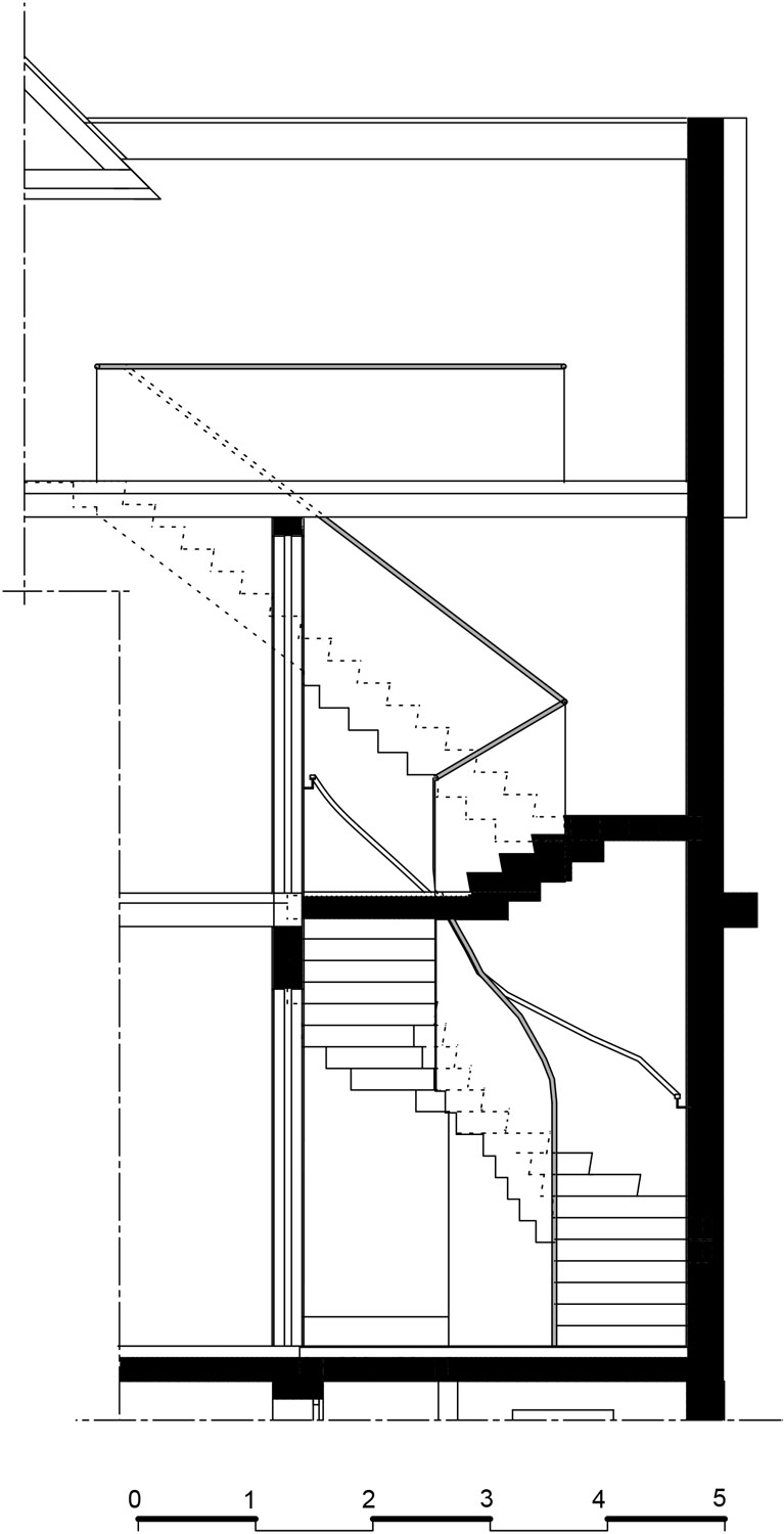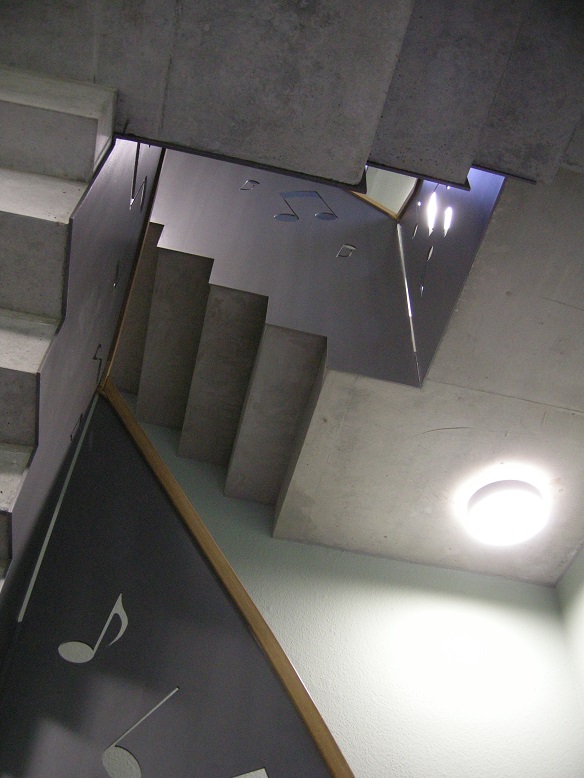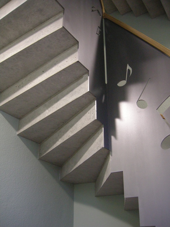 Da sich auch in den Obergeschossen Musikunterrichtsräume befinden , war es aus brandschutztechnischen Gründen erforderlich, die bestehende Holztreppe abzubrechen und durch nichtbrennbare Baustoffe zu ersetzen.